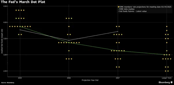在经济展望中下调了2025-2027年的经济增速预测,并上调了2025年的通胀预期,但点阵图显示美联储保持今年降息两次(至3.75%-4%区间)的预测不变。言下之意是,经济增速放缓一定程度会抵消关税带来的通胀风险,因此在关税大战前景尚未明朗之前还缺乏(快速)降息的依据。